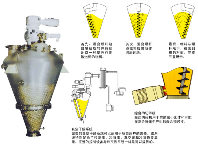 | 立式混合机广泛应用于工业生产中各种混合、干燥工艺。该机具有三重混合作用,可以在极短的时间内获得很好的混合效果。 |