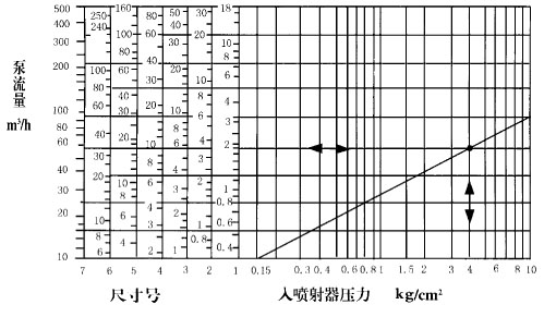 | LSG系列罐用喷射式混合器型号和尺寸号的安排十分巧妙,对于一般的工艺要求来说,总能找到理想的混合器,根据下列功率曲线,您总能得到满意的答案。 示例:己知:罐直径:3600mm 罐高度:8m 翻转泵流量:10m3/h 入混合器压力:4kg/cm2 翻转次数:0.5h/次 求解:罐用喷射式混合器的型号。 解:根据功率曲线图,罐用喷射式混合器型号应选:LSG-4 |