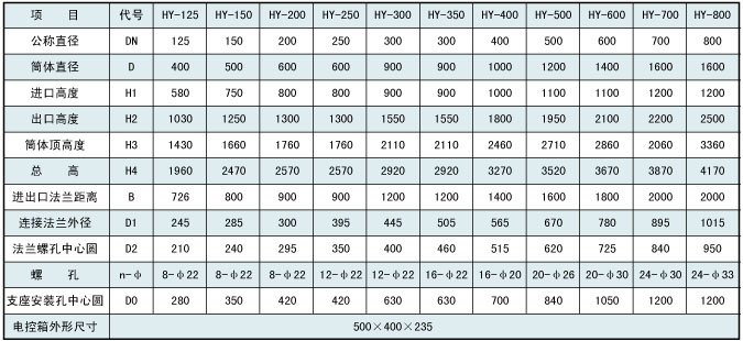 | 注:1、本过滤器的连接法兰,一般HGJ45-91PN1.0MPa 设计制造,用户如需其它标准和规格的连接法兰,或相关尺寸及排污阀方 向等需变更时,请在订货时说明。 2、如需防爆型电控箱,其外形尺寸为800×540×400。 |