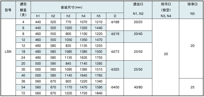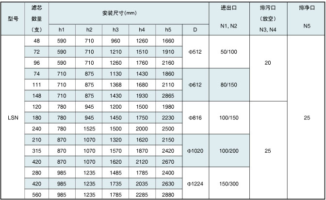 | 注:1.滤芯数指折合标准型滤芯(10”长)数目。 2.本图适用于DN≤500,由于工艺参数各不相同,因此,在订货时,我公司将按实际的工艺参数作适当修正。 |